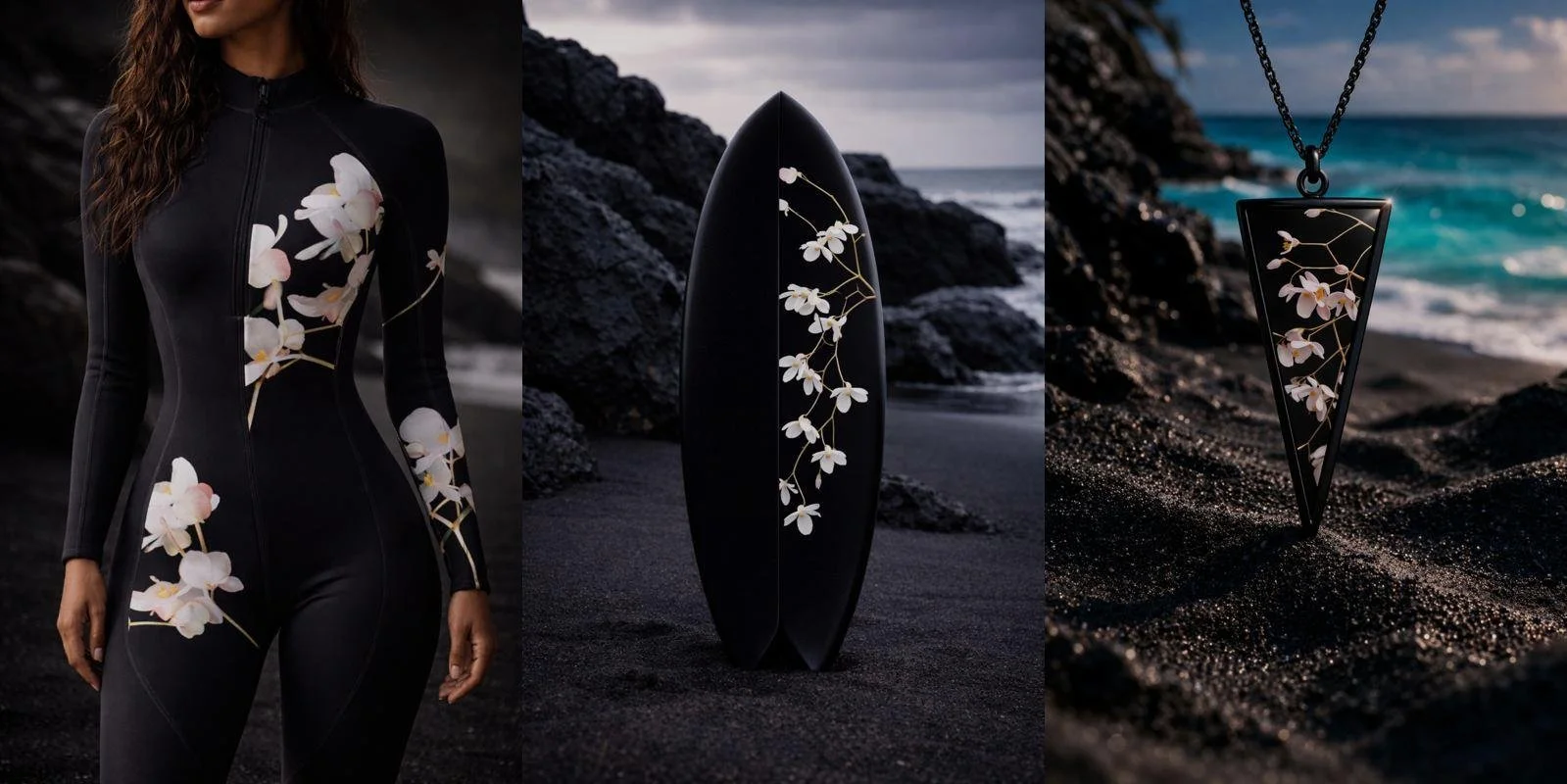 Luxury floral photography transformed into limited edition prints, designer wetsuits, and custom freediving fins.
