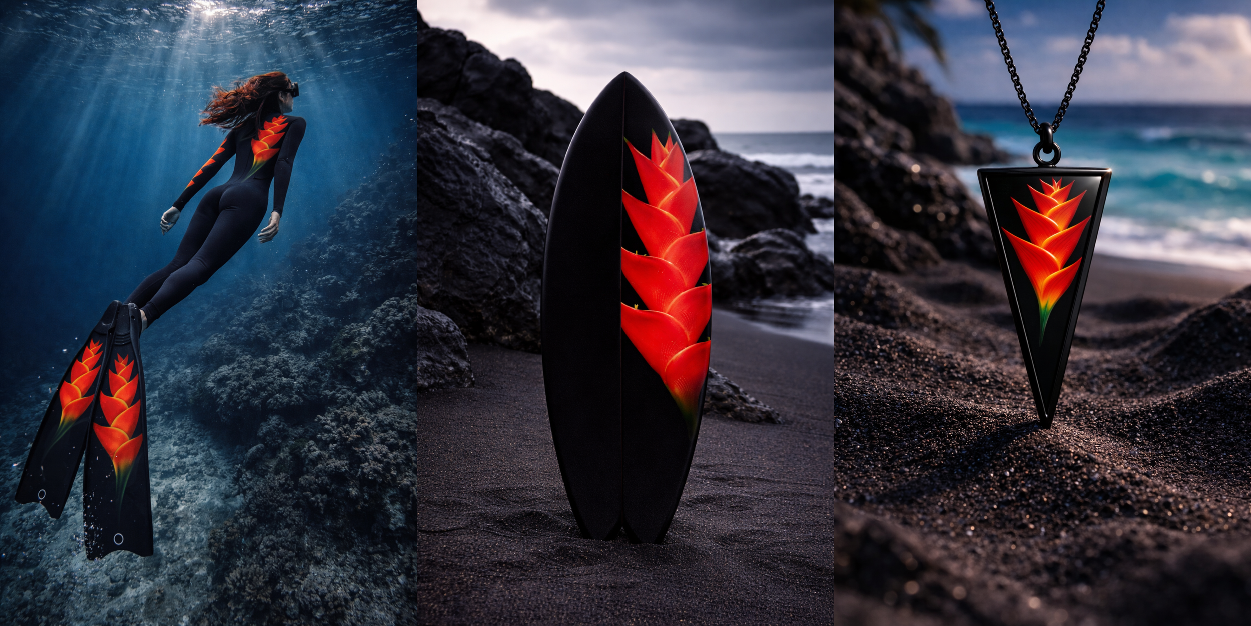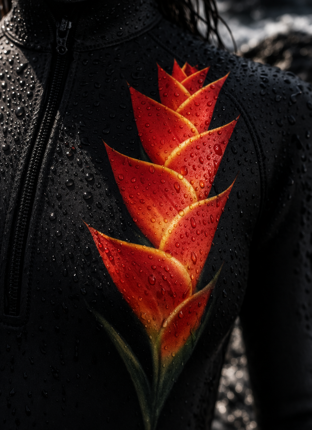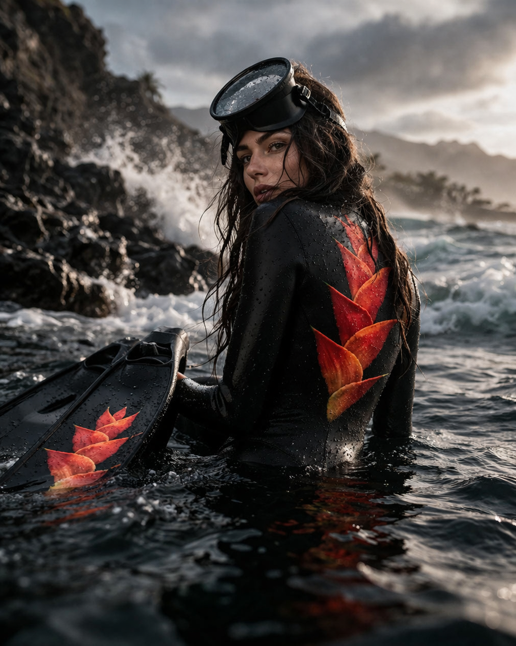 The Pele’s Fire Short Wetsuit is a luxury ocean-inspired design featuring a bold bird of paradise (heliconia) floral artwork on a sleek black silhouette. Created for movement, comfort, and visual impact, this women’s wetsuit blends performance with high-end style—perfect for warm water diving, surfing, and ocean exploration.
